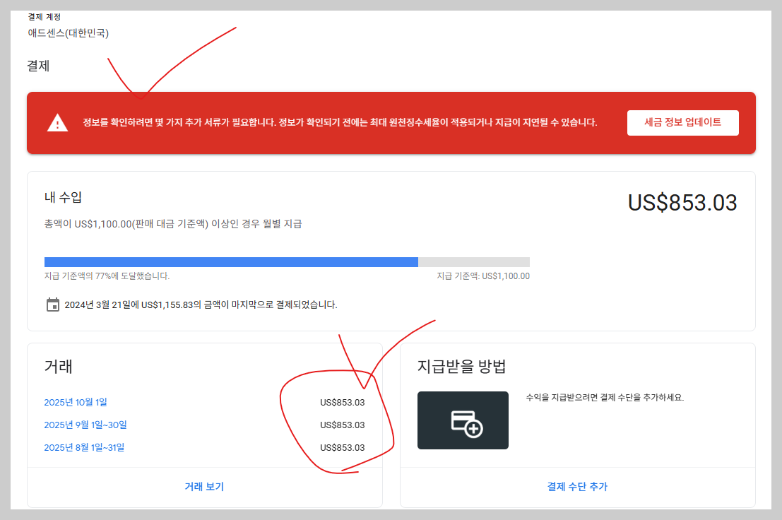 헐.. 몇달째 수익이 지급이 안되고 있었네요.