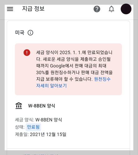 새로운 세금 양식을 제출하고 승인될 때까지 Google에서 판매 대금의 최대 30%를 원천징수하거나 판매 대금 전액을 지급 보류해야 할 수 있습니다.
