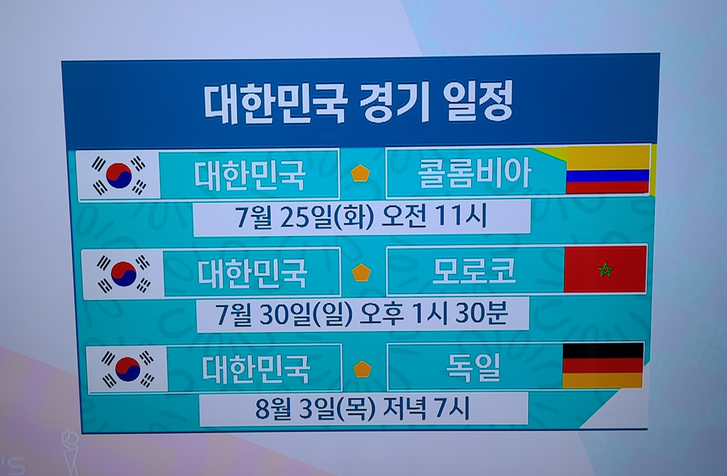 한국은 7월 25일 콜롬비아를 상대로 조별리그 첫 경기를 갖고, 이어 모로코, 독일과 차례로 대결한다.