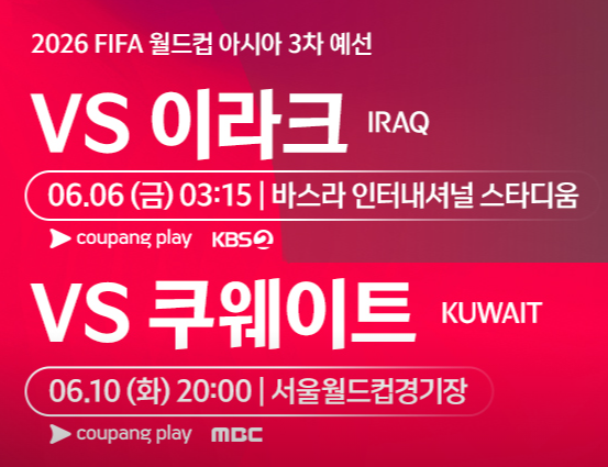 남자 축구 대표팀 경기일정2026 월드컵 아시아 3차 예선06.06(금) 03:15 vs 이라크 중계 : KBS2, 쿠팡플레이 06.10(화) 20:00 vs 쿠웨이트 중계 : MBS, 쿠팡플레이 한국 월드컵 예선 일정 시간, 결과 하이라이트 |