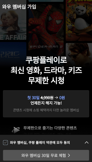 쿠팡은 지금 한달 무료 이벤트 중이네요. 언제든 해지 가능.